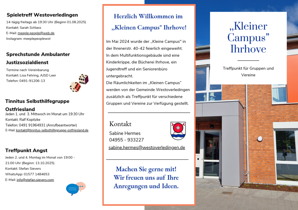 Am 04.05.2024 wurde der "Kleine Campus" in der Ihrener Str. 40-42 feierlich eingeweiht. Mit dem „Kleinen Campus“ ist in Westoverledingen ein Ort entstanden, der gemeinnützige Einrichtungen wie die Bücherei Ihrhove, den Jugendtreff und das Seniorenbüro miteinander vernetzt. Durch die Unterbringung der Kinderkrippe Inselnest ist eine räumliche Nähe zur Grundschule und zum Kindergarten entstanden, sodass die verschiedenen Bildungsangebot auf einem Areal angesiedelt sind. Der „Kleine Campus“ wird von der Gemeinde zusätzlich als Treffpunkt für verschiedene Gruppen und Vereine zur Verfügung gestellt, die zuvor im Haus Wohltat stattgefunden haben.