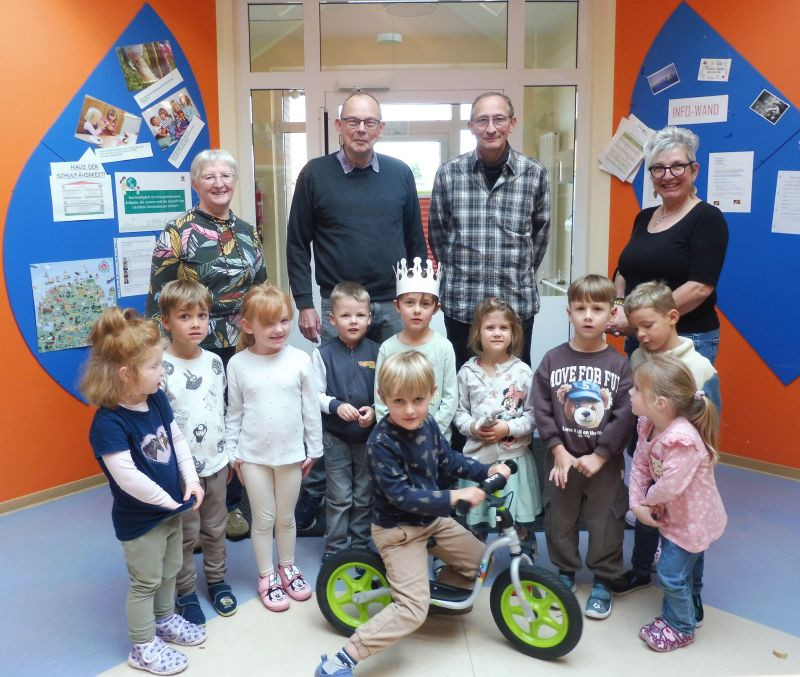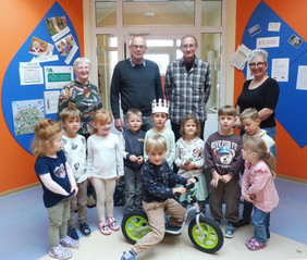 Die Vertreter der ADFC-Ortsgruppe Gernot Knipper und Marianne Ulrichs mit Bernd Wilkens übergaben die Räder an die Krippenleitung Svenja Kreklau mit ihrer Kollegin Christin Luitjens. Beim Kindergarten „Abenteuerland“ nahm die Leitung Anke Noack mit mehreren Kindern das Laufrad in Empfang.