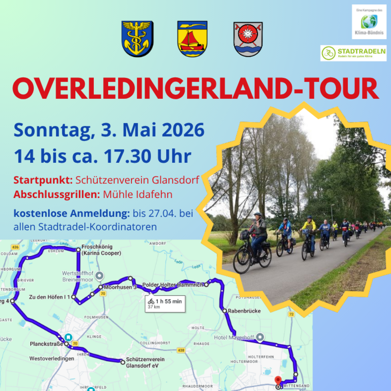 Für die kostenlose Teilnahme an der „Overledingerland-Tour“ wird um Anmeldung bis zum 27. April bei den KoordinatorInnen gebeten. Diese sind wie folgt zu erreichen: Für Ostrhauderfehn (Nicole Beck) 04952-6377 oder fedux(at)web.de. Für Rhauderfehn (Alexander Hülper) 04952-903905 oder a.huelper(at)rhauderfehn.de. Für WOL (Kirsten Beening) 04955-933230 oder kirsten.beening(at)westoverledingen.de.