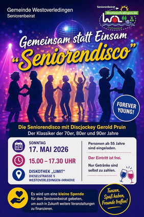 Die Veranstaltung findet am Sonntag, dem 17. Mai 2026 in Zeit von 15.00 – 17.30 Uhr in der Diskothek „Limit“ an der Dieselstraße 5 in Westoverledingen-Ihrhove statt. Personen ab 55 Jahre sind eingeladen. Der Eintritt ist frei. Nur Getränke sind selbst zu zahlen.