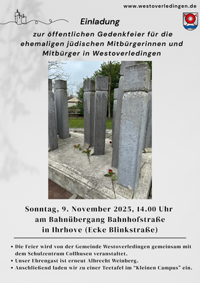 Auch dieses Jahr wird die Gemeinde Westoverledingen wieder eine Gedenkfeier ausrichten. Die Gedenkfeier wird wie jedes Jahr in Kooperation mit dem Schulzentrum Collhusen veranstaltet. Außerdem wird der Holocaust-Überlebende Albrecht Weinberg wieder als Ehrengast teilnehmen. Im Anschluss an die Gedenkfeier laden wir Sie zu einer kleinen Teetafel im "Kleinen Campus" ein.