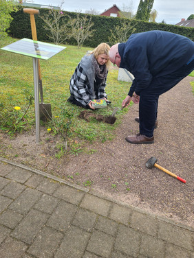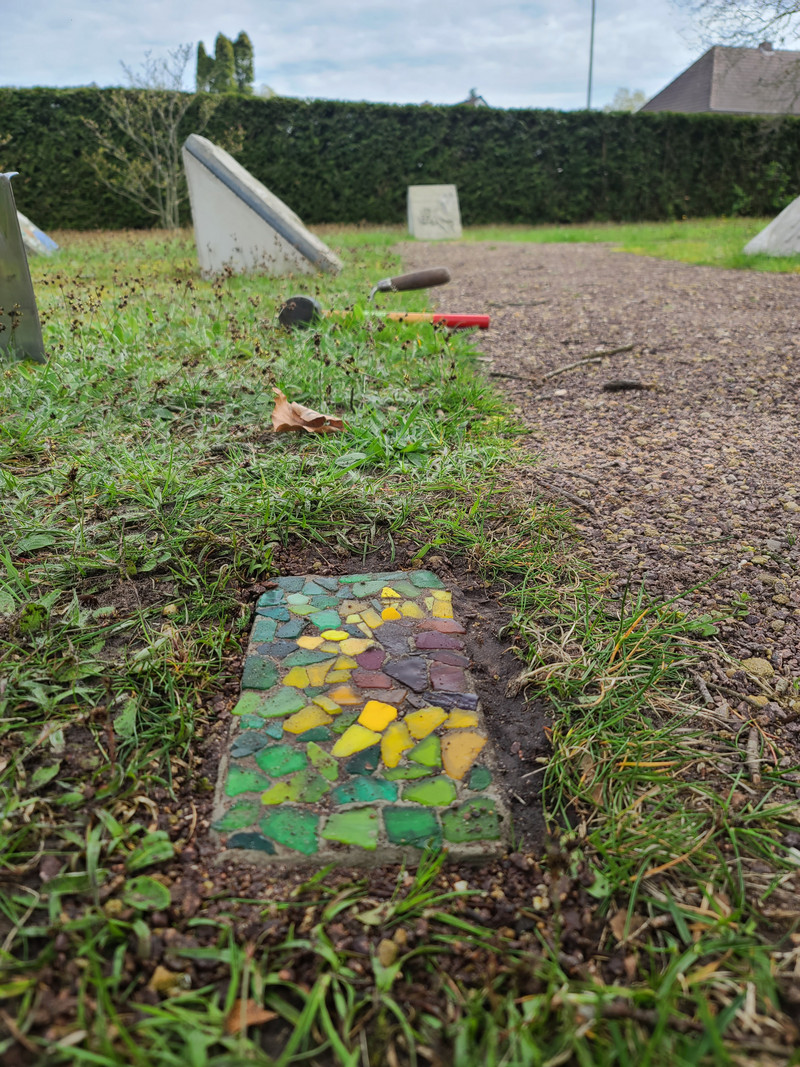Kürzlich lud die Klasse unter der Leitung der Lehrerin Hanna Mütz-Endrizzi gemeinsam mit Schulleiter Reiner Bruns Hermann Adams und Kirsten Beening, Pressesprecherin der Gemeinde Westoverledingen, zu sich in die Schule ein, um das Kunstprojekt zu präsentieren. Zusätzlich haben die Schülerinnen Anna Bron und Néle Graß einen Pflasterstein mit bunten Mosaiksteinen gestaltet. Diesen Stein überreichten die Schüler Hermann Adams während des Besuchs. Am Jahrestag der Denkmaleinweihung wurde der Stein von Hermann Adams und Hanna Mütz-Endrizzi beim Denkmal verlegt.
