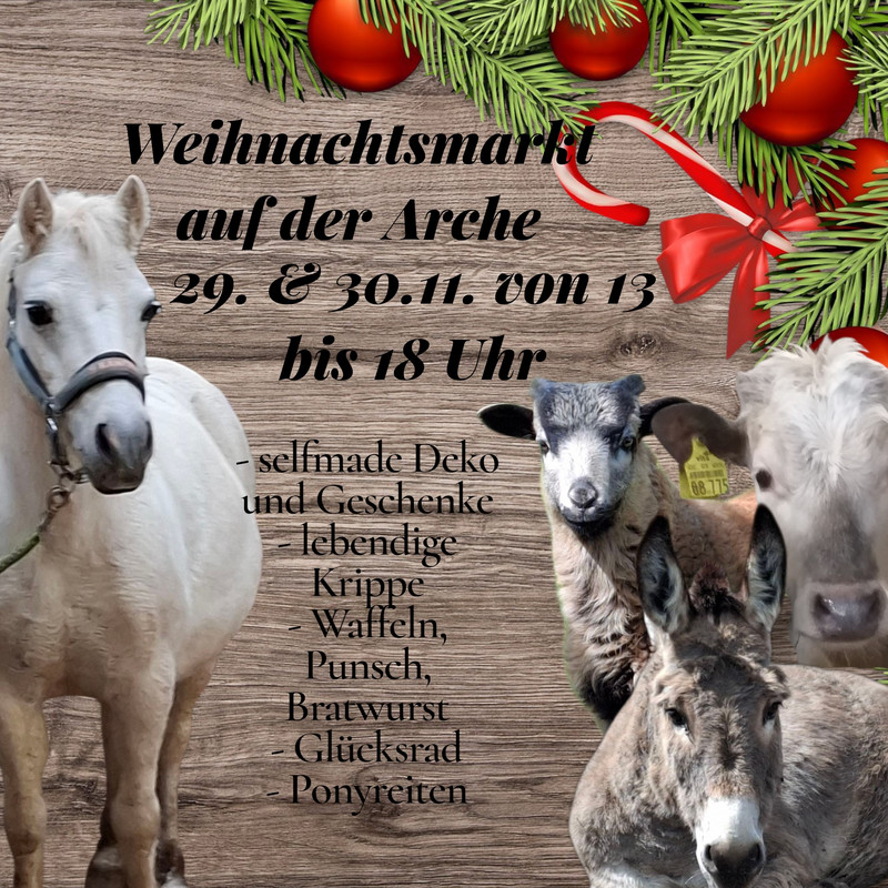 Am 29. und 30.11. ist es wieder soweit. Wenn man den großen Gulf betritt, überall warme Lichter sieht, die Geräusche der Tiere wahrnimmt und der Duft von Waffeln, Punsch und duftendem Heu einem in die Nase zieht, dann ist es wieder soweit: Die ARCHE Mitling Mark öffnet ihre Tore für ihren 2. WEIHNACHTSMARKT.