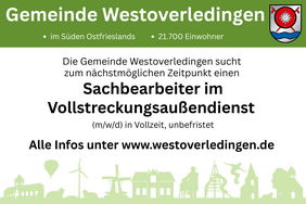 Sie fühlen sich angesprochen? Dann bewerben Sie sich bitte mit den üblichen Unterlagen (Lebenslauf, Tätigkeitsnachweisen, Zeugniskopien und Lichtbild), gerne auch per Mail an gemeinde(at)westoverledingen.de, bis zum 06.03.2026.