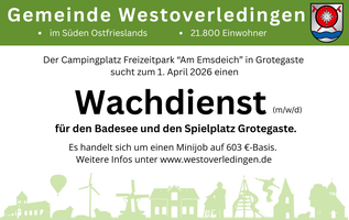 Die Gemeinde Westoverledingen sucht am dem 1. April 2026 einen Wachdienst für den Badesee Grotegaste. Es handelt sich um eine geringfügige Beschäftigung (Minijob) mit einer durchschnittlichen…